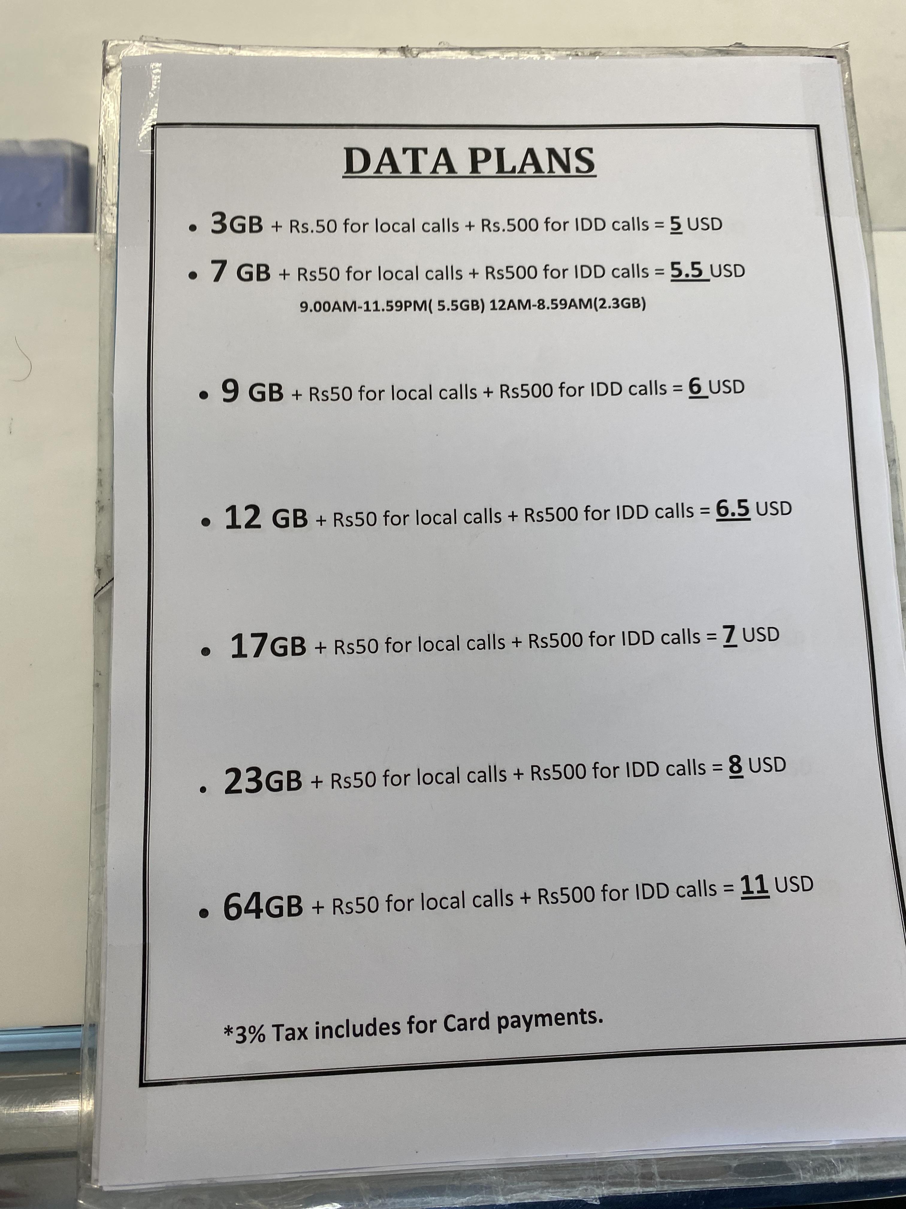 나는 어쩐지 공항이라 더 비쌀것 같고, 현지분에게 물어보고 사는 것이 좋을 것 같았다. 게다가 우리는 곧 콜롬보를 떠나 다른 지역으로 갈 예정이라 그곳에서도 쓸 수 있는지가 중요했다. 그러나 남편은 따로 구입할 시간이 있겠냐며 그냥 사자고 했고, 나는 혼자 좀 궁시렁대다가 그러자고 했다. 데이터 용량에 따라 구입이 가능하여, 바로 출근을 하는 남편은 7달러, 나는 6달러짜리로 구입했다. 사용기간은 한달이었는데 호텔에만 거의 있을 나는 다 못 쓸것 같긴 하다.